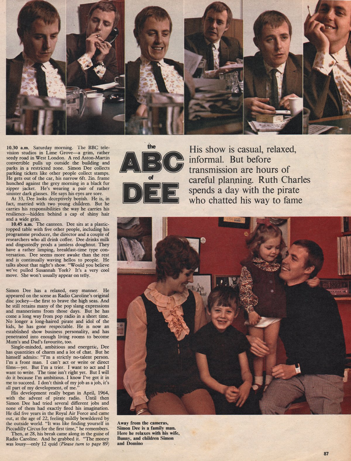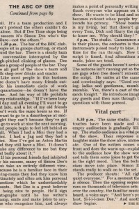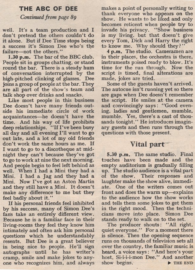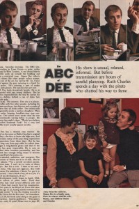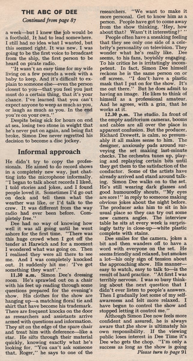This is a scan of an interview with Simon Dee at the height of his fame, taken from the June 14, 1969 edition of Woman’s Own. Although the day-in-the-life is something of a puff piece, it does feature the passage “Dee seems, to his fans, boyishly engaging. To his critics he is irritatingly incompetent”, suggesting that opinion on him was, at the very least, divided.