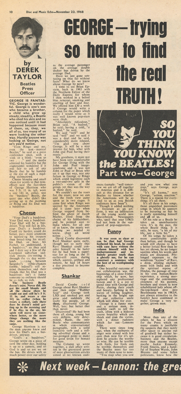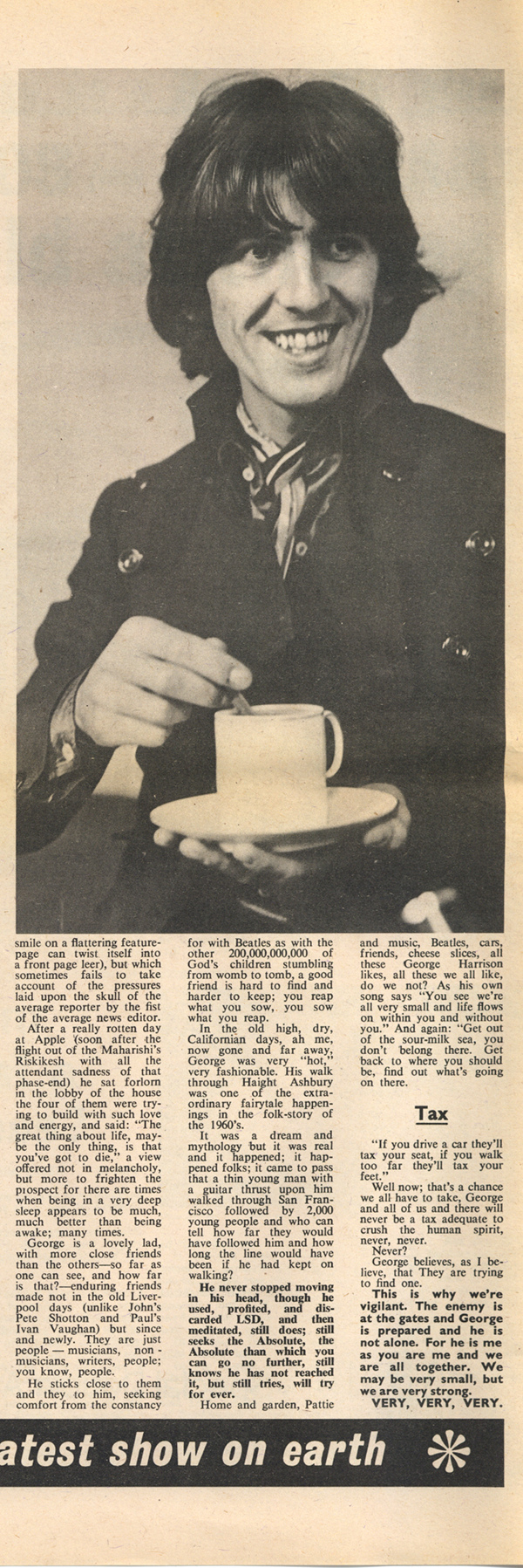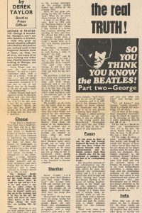 Well, I don’t think anyone could call this ‘journalism’, as it’s written by the Beatles’ press officer of the time, but it’s certainly very interesting, pointing to George Harrison thinking beyond The Beatles and clearly trying to build an image of himself as a deep thinker and musician in his own right. It is, however, an article that goes way beyond anything that we might expect from a press officer nowadays, but then again, there have been few press officers as close to a group as Derek Taylor was to The Beatles. His close friendship with George is obvious, to the point where he lapses into the pseudo-religious prose that George became famous (and ridiculed) for at the end of the article.